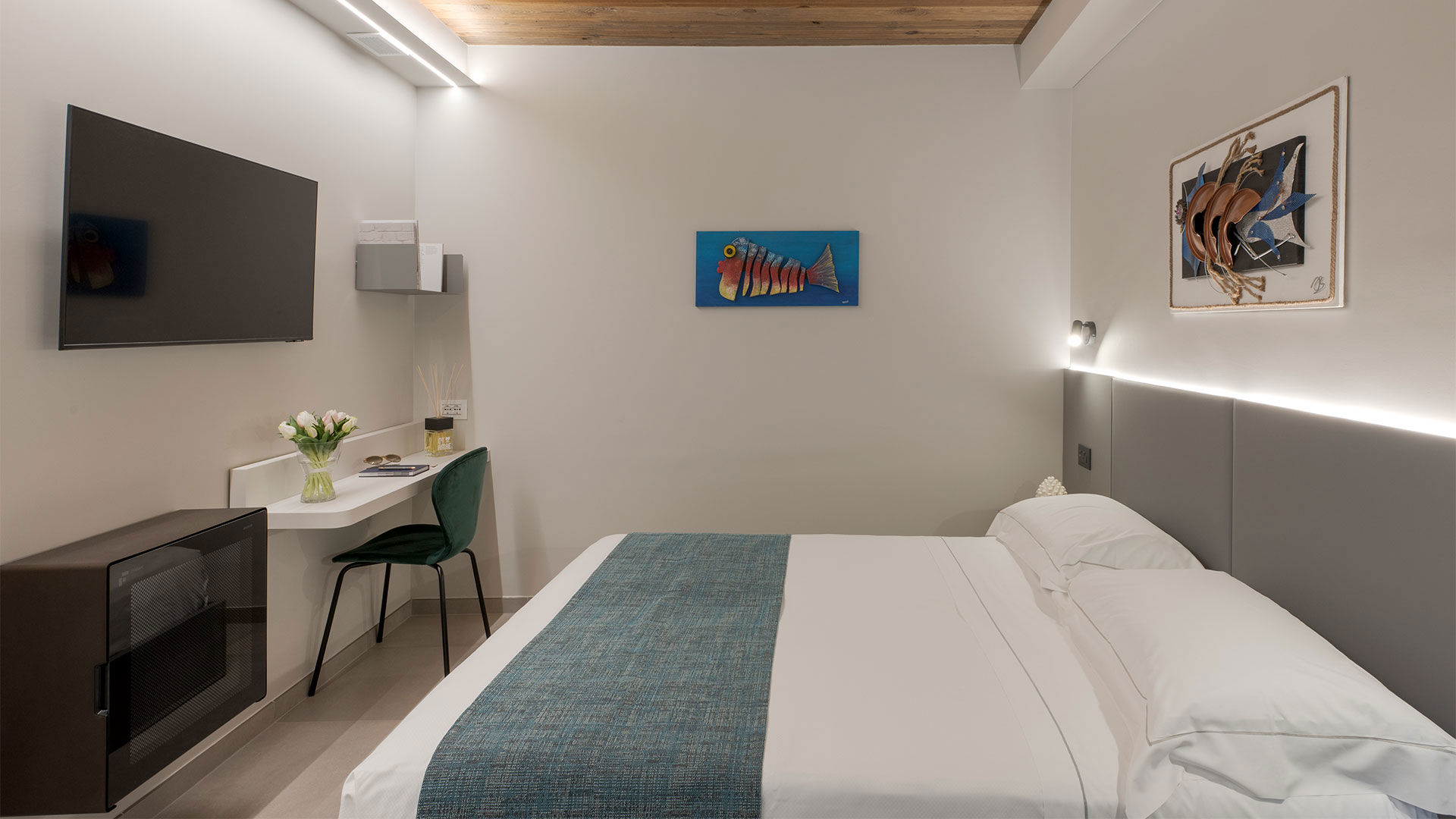 Camera doppia con letto matrimoniale o due singoli su richiesta, moderna dai colori rilassanti, dotata di tutti i confort necessari, desk, smart TV 43”, cassetta di sicurezza con alimentazione elettrica all’ interno, climatizzazione autonoma, bagno privato con ampia doccia e set di cortesia all’insegna della sostenibilità ambientale…